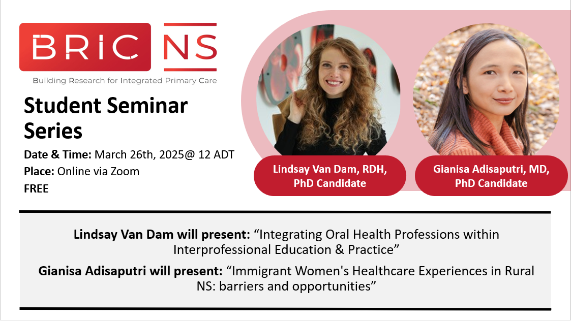 The BRIC NS Student Seminar Series is an opportunity for students across Nova Scotia to share their completed or in-progress research. Presentations cover a wide variety of disciplines, but all address the common thread of primary and integrated healthcare.